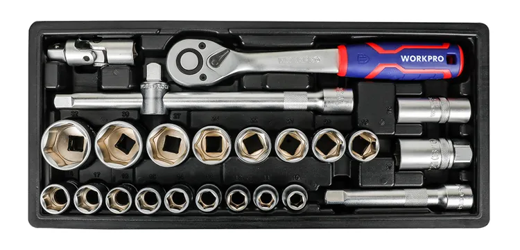 WORKPRO 24-delige Dopsleutelset – 1/2″ | 10–32 mm | Cr-V Staal | Incl. Ratel, Verlengstukken & Bougiedoppen | Foam-inlay