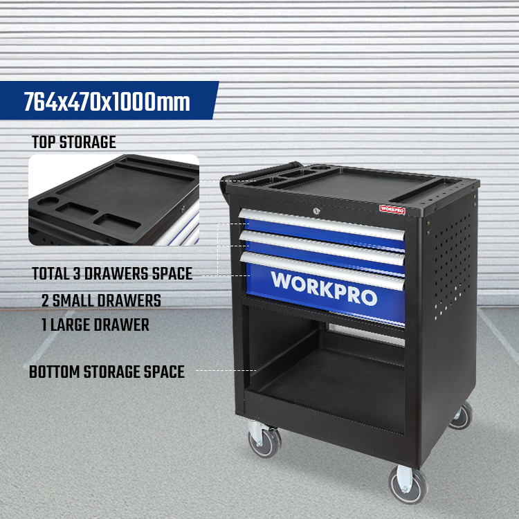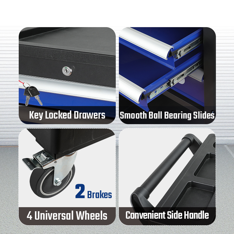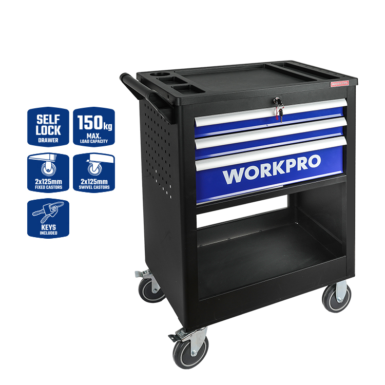 Gereedschapswagen met 3 laden, ball-bearing schuiven en zelfsluitende functie.