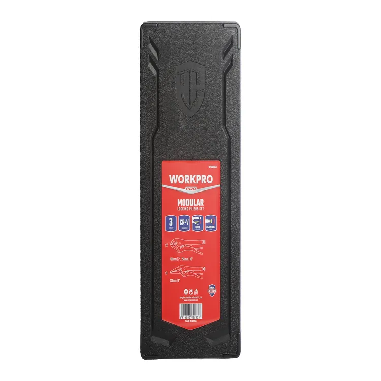 Hoogwaardige set bestaande uit een 180 mm, 230 mm en 250 mm griptang, gemaakt van duurzaam CR-V staal. Geleverd in een inlay-module, ideaal voor plaatsing in gereedschapswagens. De tangen zijn voorzien van een vergrendelmechanisme waarmee beide handen vrij blijven bij het klemmen – handig en vermoeiingsvrij. Ontgrendelen gaat snel en krachtig via de veerbelaste ontgrendelingshendel. Gesmede bekken met robuust tandprofiel zorgen voor optimale grip en lange levensduur. Geschikt voor industrieel onderhoud, montage, huishoudelijke apparaten en automotive gebruik.