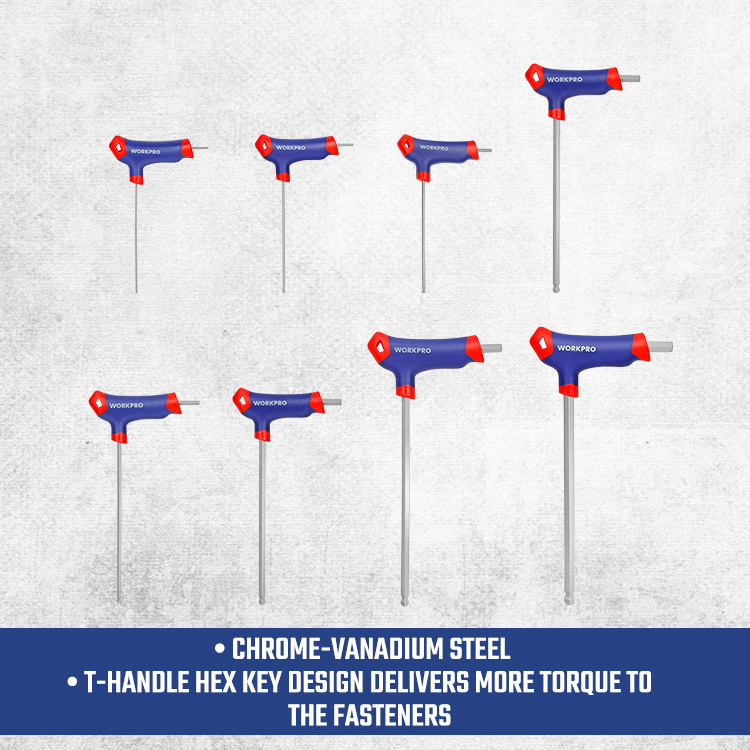 De WORKPRO WP200542 inbussleutelset bestaat uit 8 hoogwaardige sleutels met een comfortabele T-handgreep. Dankzij de ergonomische grip kun je nauwkeurig werken met minimale inspanning. Elke sleutel is uitgerust met een kogelkop, waardoor schroeven ook onder een hoek bereikbaar zijn – ideaal voor werkzaamheden op lastige plekken, zoals in de auto of machinebouw.