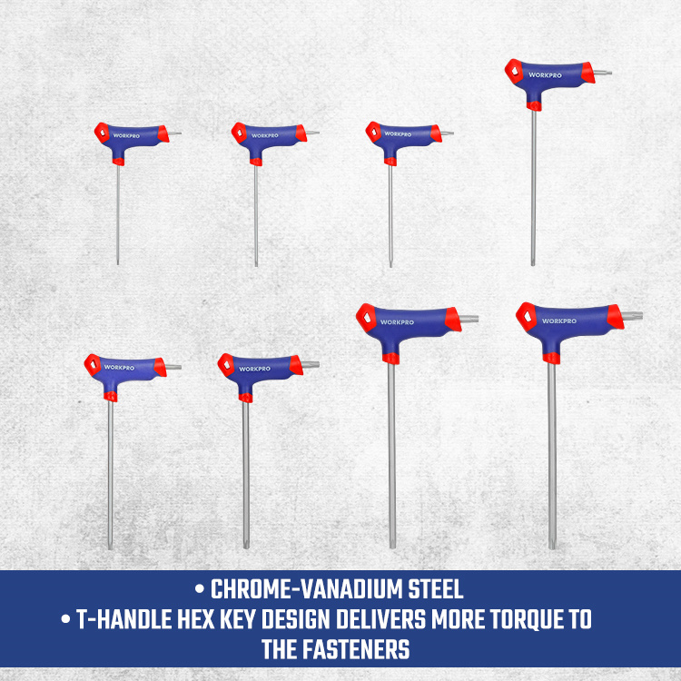 De WORKPRO WP200543 torxsleutelset is een 8-delige T-vormige set, ontworpen voor optimale krachtoverbrenging bij het los- of vastdraaien van bevestigingsmaterialen. De sleutels zijn vervaardigd uit duurzaam chroom-vanadium staal en voorzien van een ergonomisch PP/TPR handvat voor extra grip en comfort tijdens langdurig gebruik.