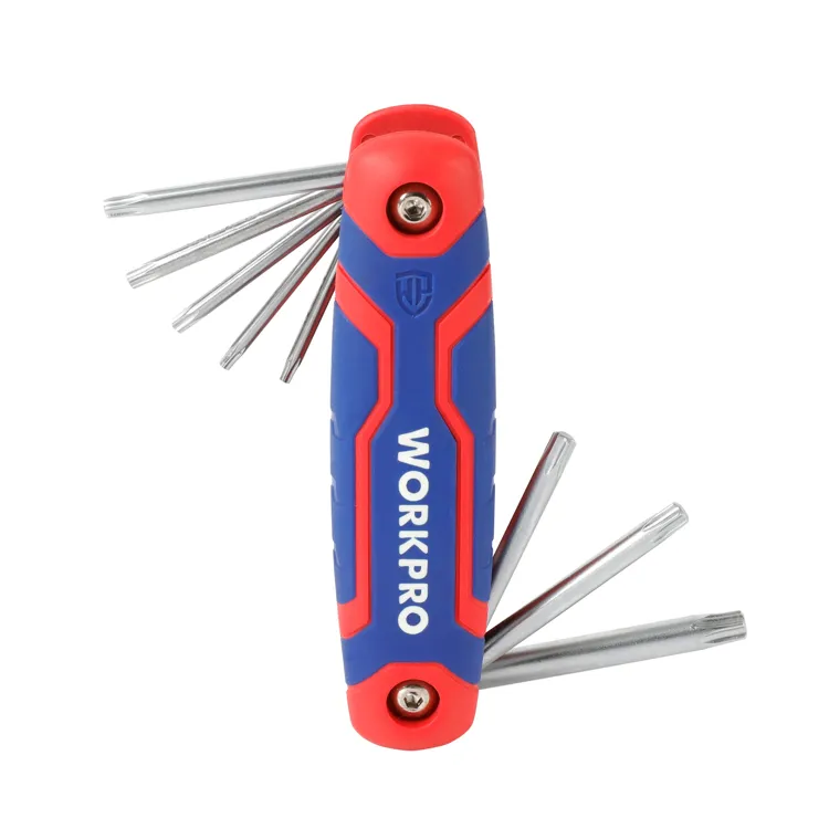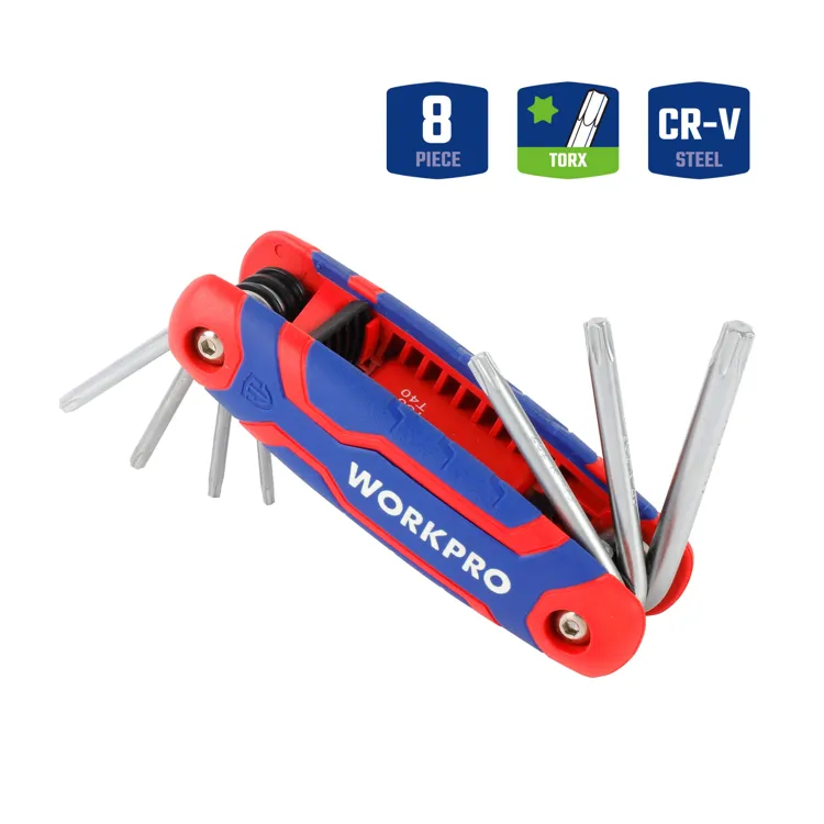 De WORKPRO WP222021 is een compacte en opvouwbare torxsleutelset met 8 veelgebruikte maten: T9, T10, T15, T20, T25, T27, T30 en T40. Dankzij het ‘Swiss Army’-ontwerp kunnen de sleutels veilig worden ingeklapt in de robuuste handgreep, wat zorgt voor gemakkelijk transport en opslag.